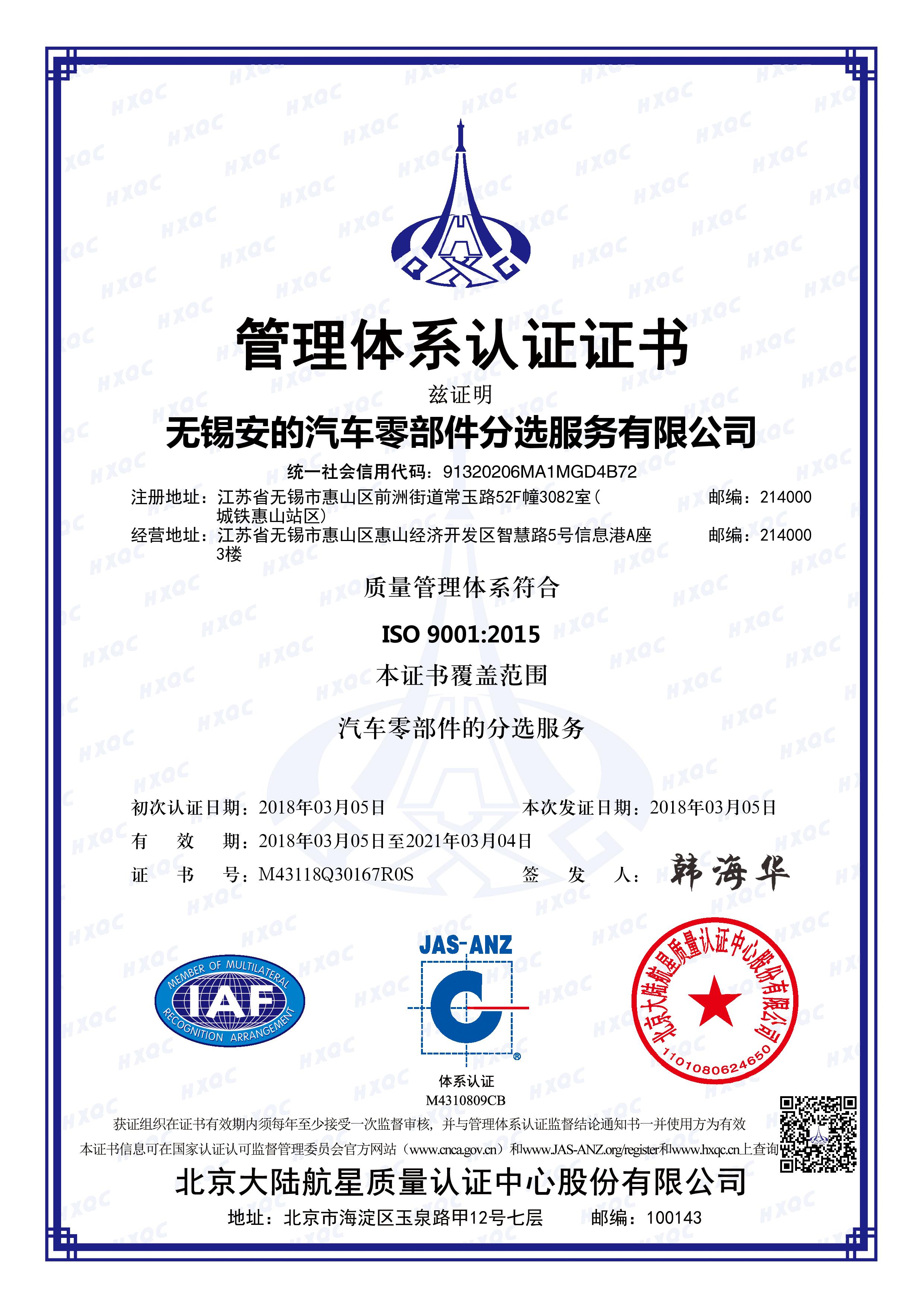 无锡安的汽车零部件分选服务有限公司于2017年3月4日顺利通过ISO 9001:2015质量管理体系认证并取得证书!!!